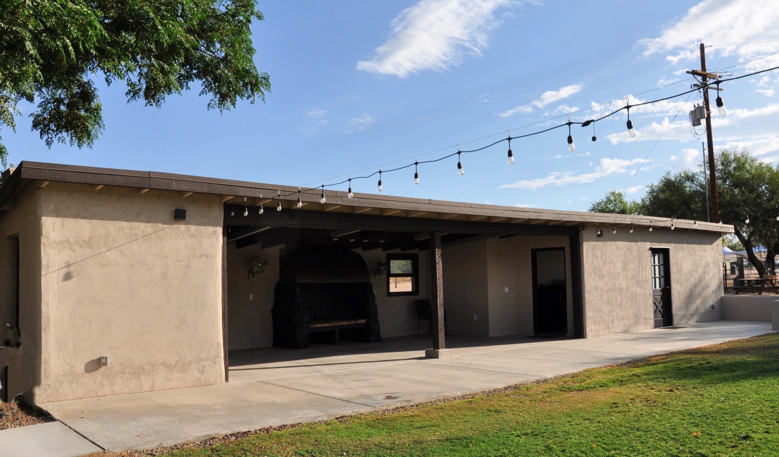 One bunkhouse (now restrooms) had two bedrooms and a bathroom; the other (now a private event suite) had one bedroom and a bathroom. A carport was added between them in the 1950s. The bunkhouses were later used for storage and were remodeled by the Town of Oro Valley in 2023.